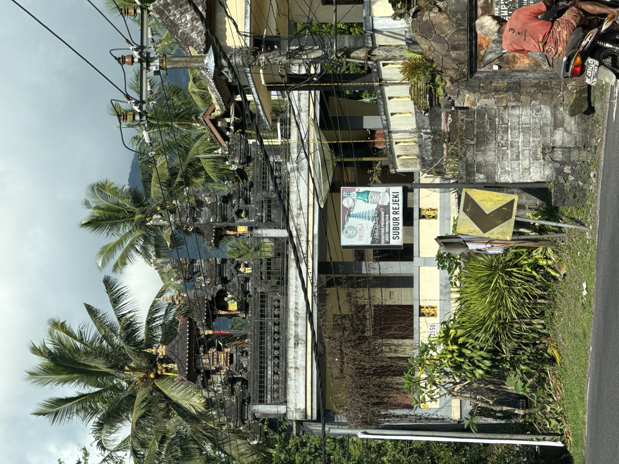 street scene in Tista, Indonesia. On the right, a man wearing a red shirt and patterned shorts sits on a parked motorcycle next to a stone wall. A yellow and black chevron sign is positioned near the base of the wall, indicating a curve in the road. A sign for "SUBUR REJEKI" is mounted on a building, suggesting a local business. Dense vegetation is present along the roadside. Across the street, a traditional Balinese structure is visible, with intricate carvings and multiple tiers. Palm trees are scattered throughout the scene, partially obscuring the structure and utility poles. Overhead, a network of power lines creates a dense visual element against the sky. The sky is overcast and gray. The scene appears to be taken during the daytime.