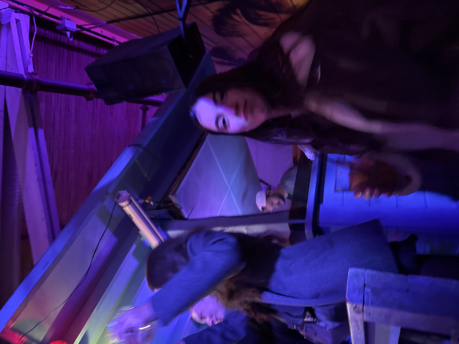 An image depicts several people in a vibrant, purple and blue lit environment. A woman with long, dark hair is in the top-right, looking toward the camera. Another person with long, brown hair is in the bottom-left, seemingly preparing a drink behind a counter. A man with a white hat stands behind the counter. Industrial, geometric structures, possibly set decorations, surround the figures. Speakers hang overhead. The scene suggests a backstage or theatrical atmosphere.
