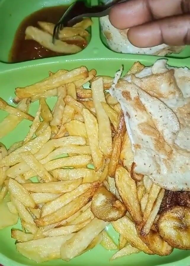 green, sectioned plate containing a meal. One section holds a reddish-brown sauce. The main section has a pile of golden-brown french fries. Fried plantains are visible amongst the fries, as well as a fried egg. A hand uses a fork to dip some french fries into the sauce. The plate is sitting on a red surface with a white floral pattern.