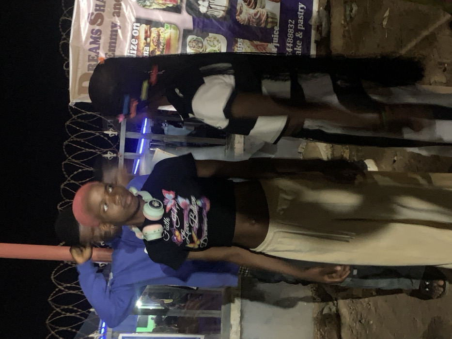 Two individuals stand in front of a banner that reads "DREAMS SHA Emmy and lize on na lips juice" and includes a phone number. The banner advertises "cake & pastry." The person in the foreground has pink hair, a black crop top with the words "Faith Love Believe" on it, beige pants, and headphones. The other person wears a black and white striped shirt and dark pants. A wire fence is visible behind them.