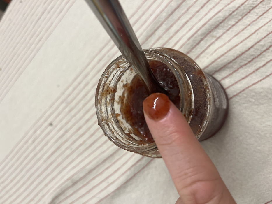 - "A close-up, top-down image depicts a human finger partially inserted into a clear glass jar containing a dark reddish-brown, viscous substance consistent with fruit preserves" by FM-IhPCF2, licensed under CC BY 4.0