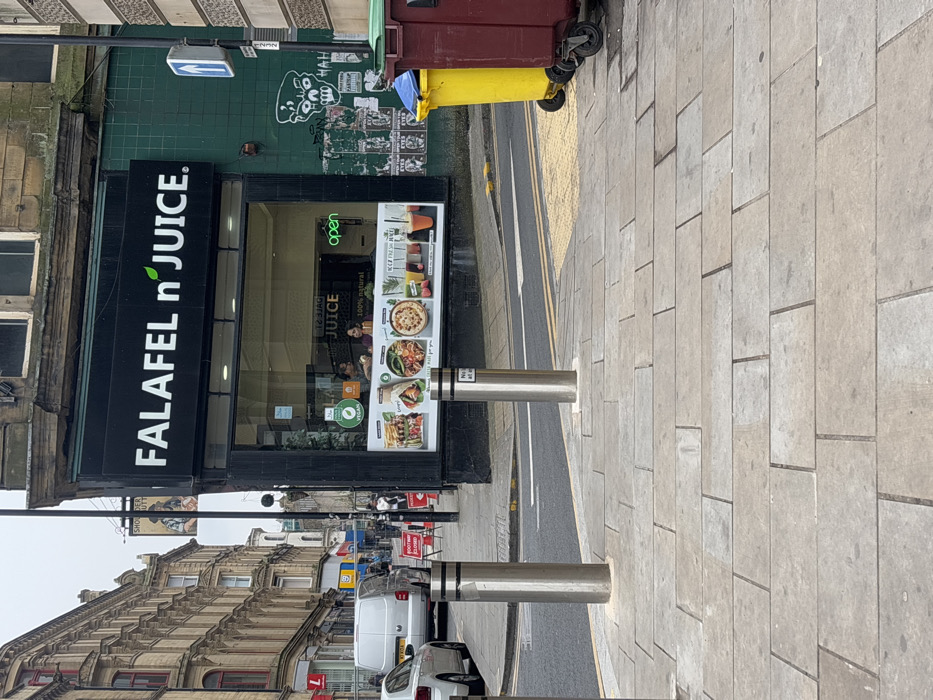A street corner in Bradford, UK, at the intersection of two streets, located at coordinates (latitude: 53.795, longitude: -1.752). The street is paved with gray stone blocks. There are three silver traffic bollards on the sidewalk, two of which are in the foreground. A white van is parked on the street, facing away from the camera. A storefront to the right of the image, facing the street, is labeled "FALAFEL 'N' JUICE." The shop window features a sign displaying the word "OPEN" and images of food, including falafel, hummus, and juice. There are two individuals visible inside the storefront, one wearing a dark cap and the other a white shirt. In the background, a yellow and maroon garbage bin is partially visible. The storefront appears to be part of a two-story brick building with a faded green tiled exterior. A weathered sign on the building reads "SHOULDER OF MUTTON".