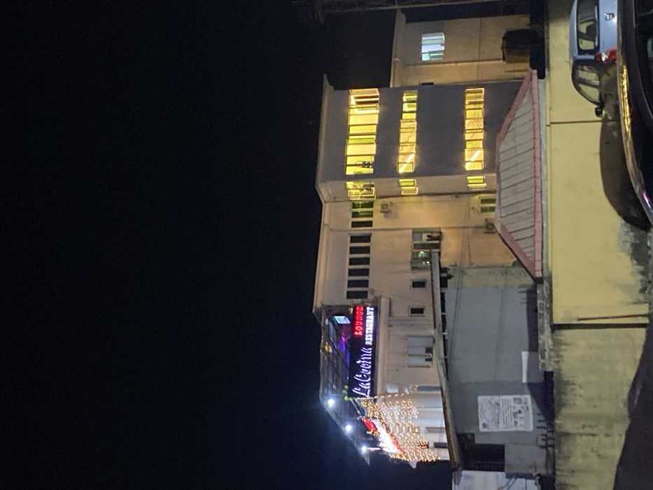 A multi-story building with illuminated windows at night. A sign reads "La Cuisine Lounge Restaurant." A car is partially visible on the right. The surrounding area appears dark, contrasting with the building's lights and signage. Decorations are seen below the restaurant sign.