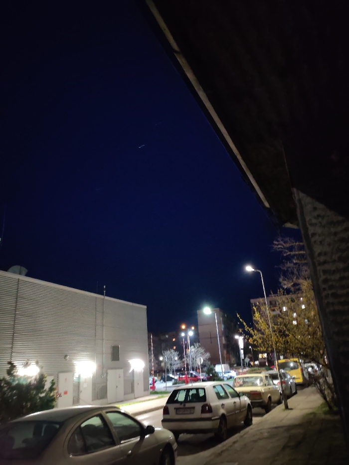The image depicts a nighttime urban street scene in Vidin, Bulgaria. The sky is dark blue with a few faint light streaks visible in the upper left quadrant. An angled, dark architectural element, possibly an overhang or part of a building, occupies the upper right corner, casting a deep shadow. On the left side of the frame, a modern-style building with horizontal corrugated metal siding is prominently featured, brightly illuminated by multiple exterior lights. Several utility boxes or panels are mounted on its facade, and antennas along with ventilation structures are visible on its roofline against the skyline. A paved street runs through the mid-ground. Parked along the left curb are at least two vehicles: a silver sedan in the immediate foreground, followed by a white Volkswagen Golf hatchback bearing a Bulgarian license plate (BG 0092 XX). Further down the street, additional parked vehicles include a beige sedan, a silver sedan, and a yellow van or bus. To the right of the street, a sidewalk is visible, lined with bare-branched deciduous trees and shrubs, some retaining yellowed foliage. A tall streetlamp with a bright white light stands on the right side, illuminating this area. In the background, several multi-story apartment buildings, some with illuminated windows, are discernible under the glow of additional streetlights and distant urban lighting. No individuals are visible in the scene. The overall environment is that of an artificially lit urban setting during evening hours.