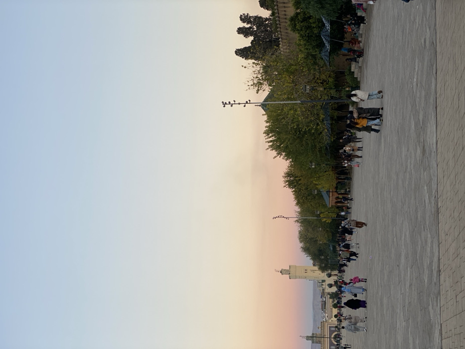 An outdoor scene features a tree-lined walkway filled with pedestrians. Streetlights with birds perched atop are visible. A building is seen in the distance under a gradient sky transitioning from blue to peach. The walkway is paved and occupies a significant portion of the right side of the image. People are walking along the path, their figures relatively small in scale.