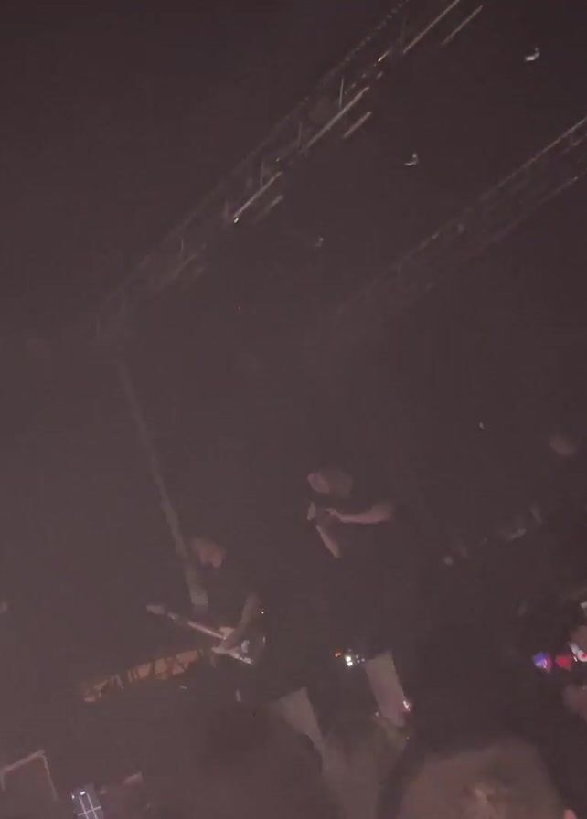 concert performance. Initially, the stage is bathed in red light, making it difficult to discern details. Figures, presumably performers, are visible on a slightly elevated platform, obscured by the strong lighting and the crowd. The crowd, visible in the foreground, is holding up phones, likely recording the event. The lighting then shifts, transitioning to a more subdued, darker environment, revealing more of the stage structure and the silhouettes of the performers. The stage is equipped with scaffolding, and the performers are seen holding instruments, suggesting a musical performance.