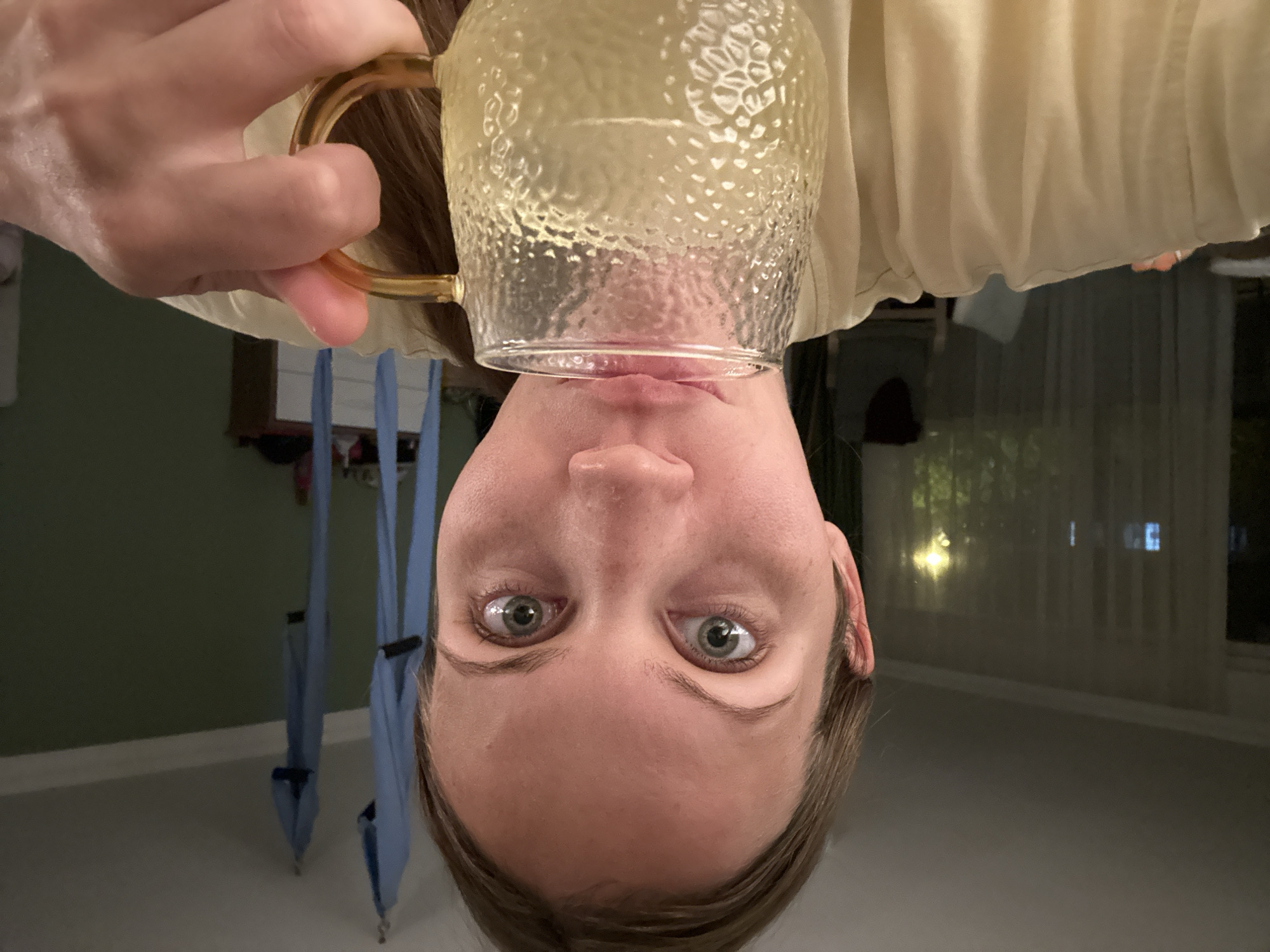 A fair-skinned person is holding a glass mug with a gold handle upside down so that the rim is pressed against their upper lip