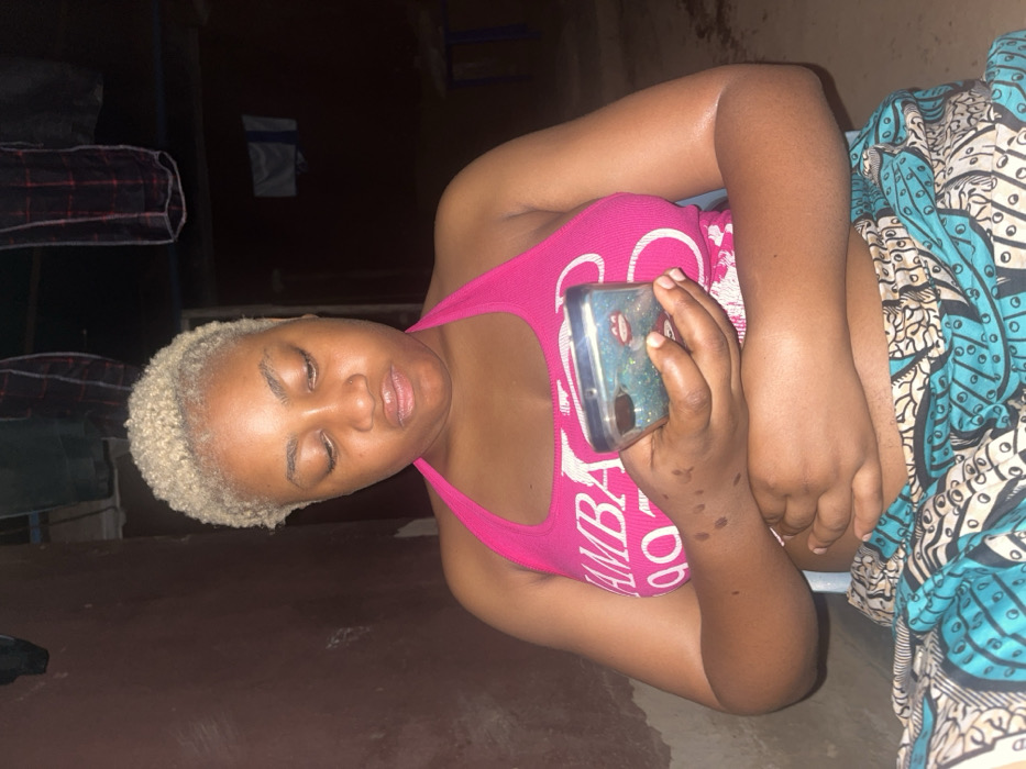 A woman with blonde hair is lying down wearing a pink top and holding a phone. She appears to be in a dimly lit room. Bunk beds are visible in the background. A patterned blue and white cloth covers the lower portion of her body. The woman's right arm has several small, dark spots. She is looking at the phone in her hand.