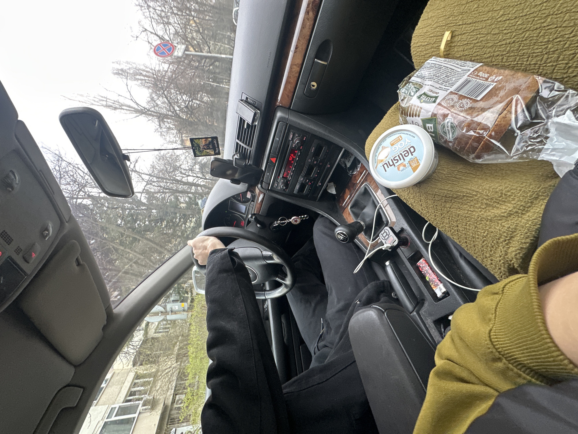 The image captures the interior of a car, likely a grey Audi, from the driver's perspective. The person is seated in the driver's seat, holding the steering wheel, and wearing a black jacket over what appears to be an olive green sweatshirt. On the passenger seat, there is a loaf of wrapped bread and a container of "delishu" yogurt. The dashboard and interior console are visible, showcasing the car's radio, gearshift, and other controls. Hanging from the rearview mirror is an identification card. Through the windshield, a street scene is visible, featuring buildings and trees. A road sign indicates a restricted area with a crossed out circle and blue border. The location is Sofia, Bulgaria.