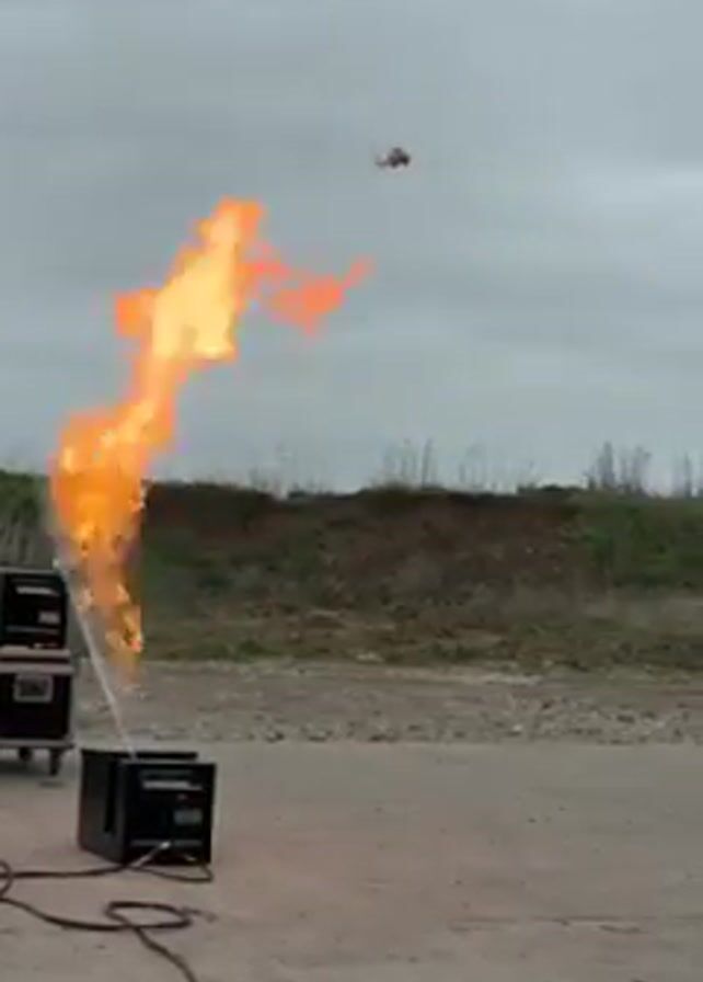 - "The scene shows a helicopter flying against a cloudy sky, with a fire effect shooting flames upward from a black device situated on a concrete surface" by FM-H3TWA2, licensed under CC BY 4.0
