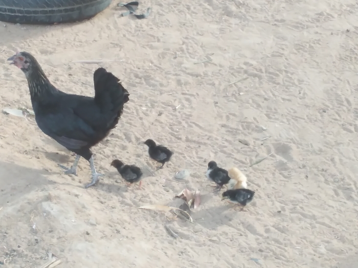 - "The image displays an adult black hen and five chicks on sandy ground in Narayi, Nigeria" by FM-MFWzc2, licensed under CC BY 4.0