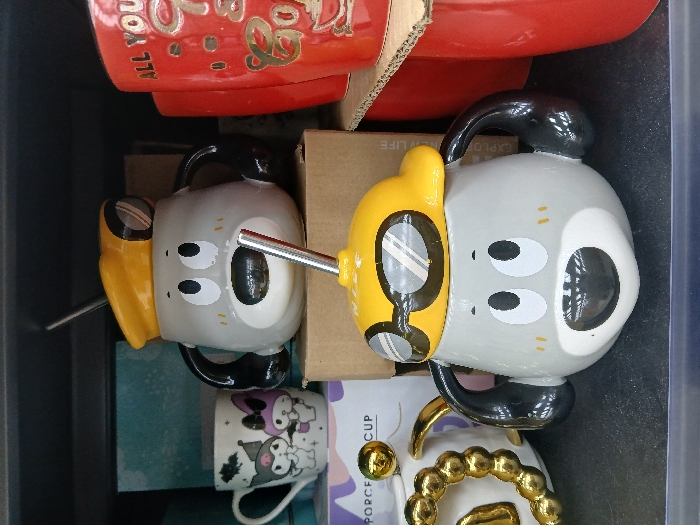 collection of mugs in a drawer or storage container. An orange mug sits at the top. Below are two cartoon-themed mugs, one gray with a yellow detail and a metal straw, the other similar. There is also a white mug with a gold chain detail and a small, white mug with black characters. They appear to be stacked or packed together.