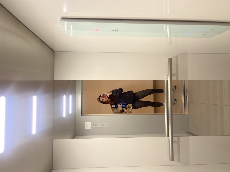 A woman, reflected in a mirror, stands in an elevator taking a selfie with her smartphone. She wears a hooded sweatshirt, patterned leggings, and carries water bottles. The elevator has a white interior with vertical light fixtures on one wall. A control panel is visible on the ceiling. An elevator door and a glimpse of another room are seen in the mirror.
