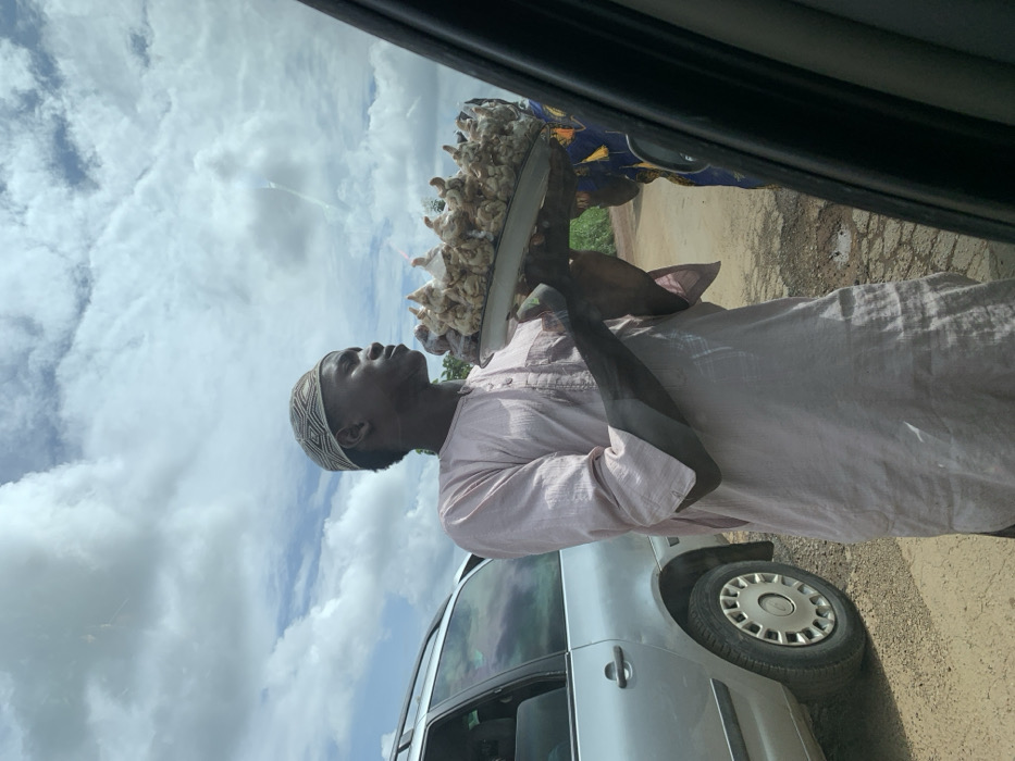 - "A male street vendor, appearing to be in his twenties or thirties, stands on a dirt road in Gidan Waya, Nigeria, holding a circular metal tray laden with numerous individually packaged, conical-shaped items, likely snacks or food" by FM-PjuW22, licensed under CC BY 4.0
