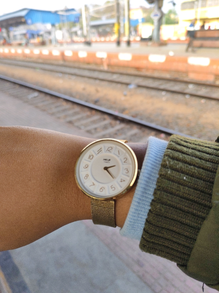 A close-up, first-person view displays a left forearm and wrist, featuring a gold-toned Helix Time analog wristwatch with a white face and a mesh strap. The watch indicates approximately 11:25. The arm, exhibiting a light brown skin tone, is partially covered by a light blue undershirt cuff and a green, ribbed long-sleeved garment. The subject is positioned on a grey concrete surface, likely a platform at a train station in Bardhaman, India. In the blurred background, two sets of railway tracks run diagonally, bordered by an orange-colored wall or barrier. Further in the distance, indistinct blue-roofed station structures, overhead railway lines, and faint human figures are visible on a distant platform, indicating a bustling railway environment.