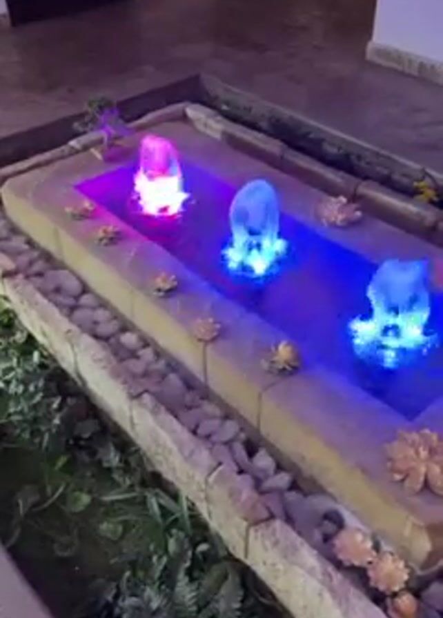 rectangular indoor fountain with three jets of water illuminated with colored lights. The water shoots upward in a bulbous shape. The left jet is lit in purple, and the other two in blue. The fountain is constructed of tan stone. The sides are decorated with artificial lotuses and small stones. Artificial greenery is around the base of the fountain. The background shows an indoor space with three doors, each dark and recessed. The floor is tiled.