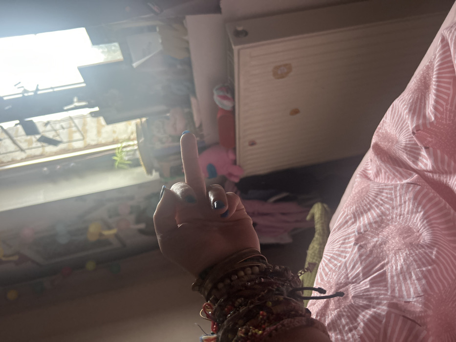 The image depicts an indoor scene in Incarville, France. A person's left hand is prominently positioned in the center-left, extended forward with the middle finger raised in an obscene gesture. The fingernails are painted light blue. The wrist is heavily adorned with numerous bracelets composed of various materials, including beads, woven cords, and metallic elements. In the foreground, a pink bedsheet with a repetitive white radiating line pattern covers a surface, likely a bed. The background features a room interior illuminated by bright natural light entering from a window on the right. Through the window, an exterior building or wall is partially visible. On the windowsill, several objects are discernible, including a small potted plant, frames, and a pink plush toy. Below the windowsill, a white panel radiator is present, exhibiting multiple small, irregular brown stains. The immediate environment suggests a private room.