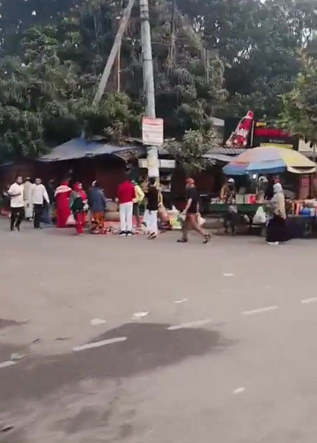 bustling street market in what appears to be a South Asian setting. People are seen walking and browsing stalls set up along the roadside. The stalls are covered by colorful umbrellas and awnings and display a variety of goods, including produce, and other items. There is also a lot of greenery, with large trees lining the street. The weather appears overcast, and the road is somewhat wet. There's a visible amount of pedestrian traffic, with individuals dressed in diverse clothing, including traditional garments and casual wear. The overall atmosphere is lively and characteristic of a busy marketplace.