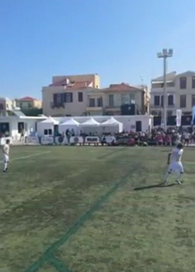 penalty shootout on a green artificial turf soccer field. A player in a white uniform is taking a penalty kick toward a goalie in a pink uniform. The shot is taken, and the camera follows the player, showing the goalie in the pink uniform moving to his left to attempt to block the kick. Other players wearing white and pink uniforms are gathered along the sideline of the field behind the goalie. There is a small crowd of people watching from behind several white tents that are set up along the edge of the field. Buildings and trees are visible in the background, and the sky is clear and blue.