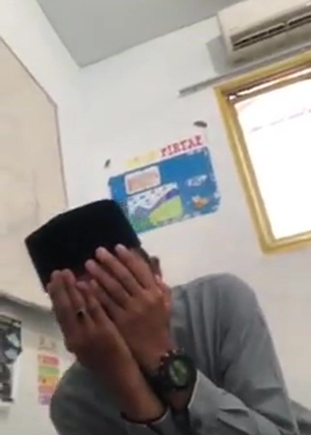 A man is seated indoors. He is wearing a gray shirt, a black peci hat, and a watch on his left wrist. He is holding his hands over his face. A whiteboard and bulletin board are visible in the background. An air conditioner is mounted on the wall.