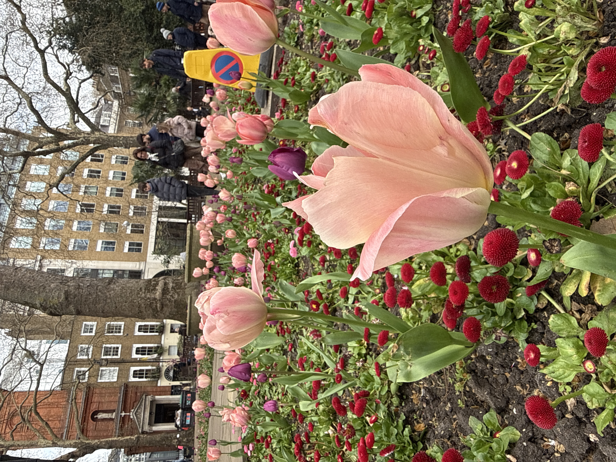 The image captures a flowerbed in a London park, likely in spring, filled with pink tulips and small red daisy-like flowers. The perspective is close-up, focusing on the flowers. In the background, there is a building with multiple windows. People can be seen in the park behind the flowers. There is also a yellow sign with a blue circle and a red line through it. The tree is bare of leaves in the background.