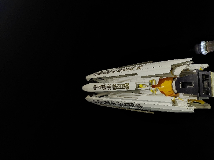The scene, captured at night, displays a prominently lit, retractable umbrella-like canopy situated within the courtyard of the Baiturrahman Grand Mosque (Masjid Raya Baiturrahman) in Banda Aceh, Indonesia. The central canopy consists of multiple tall, white, segmented panels, each adorned with black and gold Arabic calligraphy and geometric patterns. These segments converge upwards, appearing in a partially closed or retracted configuration, above a dark, rectilinear base that supports an illuminated golden-orange bulbous component with yellow structural accents. In the lower right portion of the image, a section of a mosque minaret is visible, characterized by a dark finial or dome positioned above an illuminated shaft. The background is uniformly black, indicating nighttime conditions with artificial illumination targeting the architectural elements. No individuals or specific actions are depicted.