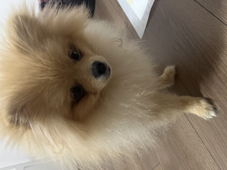 The image depicts a small, fluffy dog, consistent with a Pomeranian breed, standing indoors