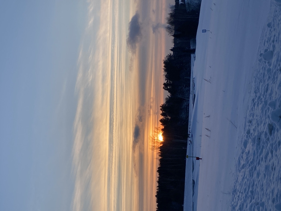 A horizontal landscape shows a winter sunset. Trees line the horizon with the sun peering through. To the right, a snow-covered field extends, dotted with small vegetation poking through. The sky features striped clouds in shades of blue, yellow, and orange, stretching from the horizon to the upper left. A small dark cloud is also visible. A small flag marks a location on the snowy field.