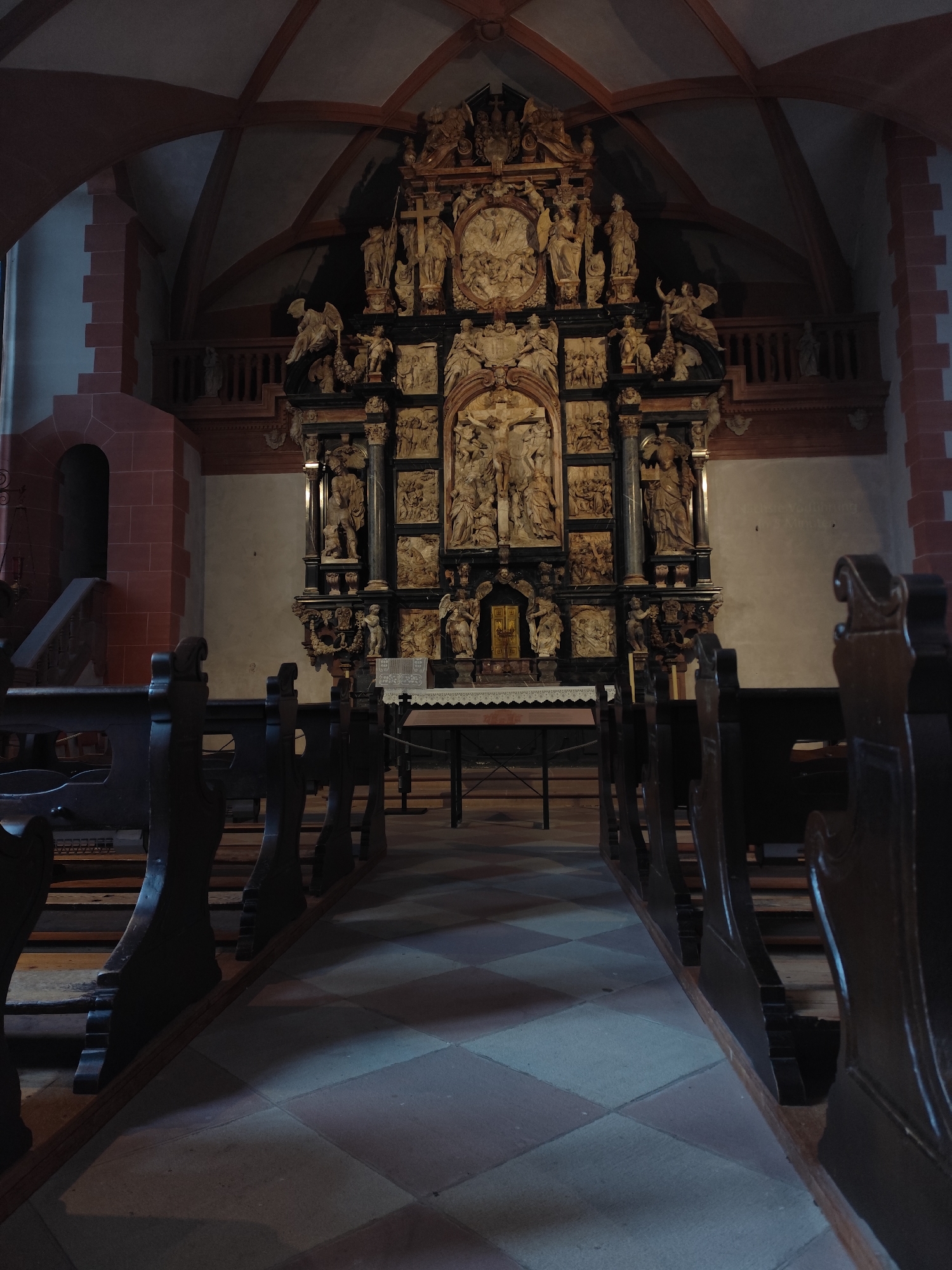 This image depicts the interior of a historic church, located in Aschaffenburg, Germany. The view is from the rear of the nave, looking forward along a central aisle towards the main altar and altarpiece. In the foreground, dark, ornately carved wooden pews line both sides of the aisle. The floor is paved with a checkerboard pattern of light grey and darker reddish-brown square tiles. No individuals are present in the pews or aisle. The midground is dominated by a large, multi-tiered altarpiece, constructed from dark wood or stone, positioned centrally. The altarpiece is intricately carved, featuring numerous sculpted figures and relief panels. A prominent crucifixion scene is visible in the central upper section. Below this, numerous figures of saints and angels, along with narrative scenes, are arranged in various niches and panels. A small, golden tabernacle-like structure is visible at the very bottom center of the altarpiece, resting on an altar table covered by a white, lace-edged cloth. The background reveals the church's architectural elements. The walls are predominantly light-colored, with structural elements composed of dark red sandstone or brick, forming robust pillars and arches on the left and right. On the far left, a high, dark arched recess or doorway is visible within the red stone wall, accompanied by a short flight of stairs. Above, the ceiling is vaulted, characterized by dark wooden ribs supporting lighter, likely plastered, infill panels. Wooden balconies with railings are visible high above the nave on both the left and right sides. The scene is devoid of people, activity, or interactions. The lighting is dim and atmospheric, casting shadows that emphasize the architectural and sculptural details.