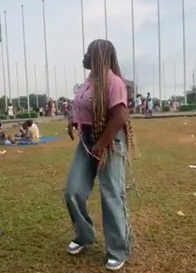 A young woman with long blonde braids, wearing a light pink short-sleeved button-down shirt, baggy jeans, and white sneakers, stands in a grassy field. She gestures with her hands and moves to the music. Behind her, a row of flagpoles stands against a slightly overcast sky. People are scattered throughout the field, some sitting on blankets. A black purse hangs from her shoulder.