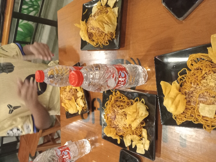 A table arrangement includes three square black plates, each filled with golden noodles topped with fried wontons. Two plastic water bottles, both with red caps and partial labels, sit between the plates. A partially visible person in a yellow shirt with a logo occupies the left side of the frame. A cell phone is near one plate, and another water bottle rests on the lower left of the table. The table surface is a warm brown wood.