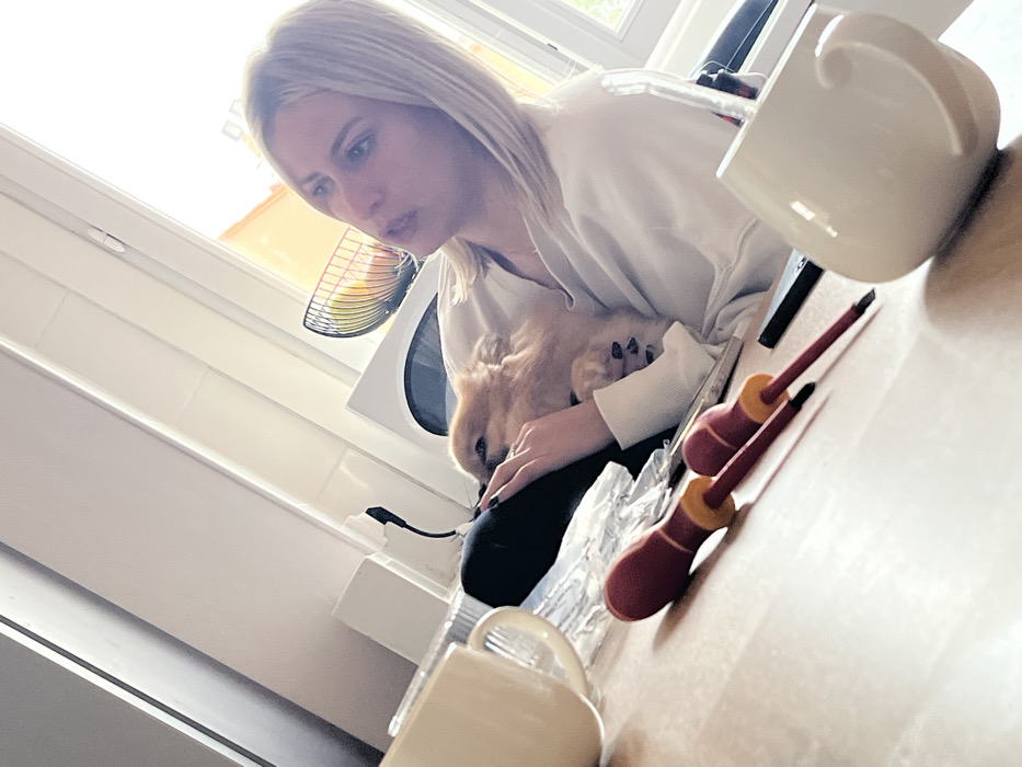 An indoor scene depicts a blonde woman, with hair styled straight to her shoulders, seated and holding a small, light-brown, fluffy dog in her lap. She is wearing a light-colored, long-sleeved top and black trousers. Her left hand, featuring dark nail polish, rests on the dog. Her gaze is directed off-camera to the right, mouth slightly open as if speaking or reacting. The dog's face is nestled against her chest. In the foreground, on a light-colored table surface, two cream-colored mugs are visible: one partially cropped on the left and another on the right. Between them lie two screwdrivers with red and yellow handles. The background reveals a brightly lit window, suggesting daylight. Beyond the window, an orange-hued building facade is partially visible, indicating an urban or residential setting. Inside, a white microwave oven is visible, topped with a black wire fruit basket containing fruit. White walls and a vertical support beam are also discernible. The overall environment suggests a kitchen or dining area within a residence. This scene is situated in a residential interior in Cannes, France.