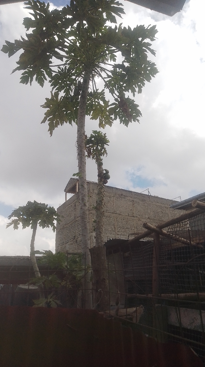 Three tall papaya trees dominate the foreground, their large, palmate leaves reaching skyward. One tree bears several ripening fruits. Behind the trees, a blocky, two-story building is visible, capped by a simple, sloped roof. Fencing and corrugated metal structures partially obscure the view at the bottom of the frame, creating a sense of enclosure. Overcast skies provide a diffused, soft light.