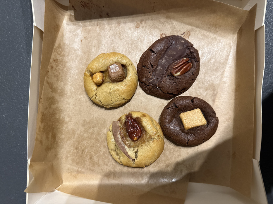 Four cookies sit in a square paper box
