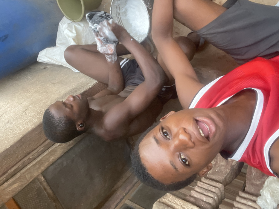 Three young men are pictured in a candid shot. One is topless and appears to be washing a shoe in a bucket of soapy water. He is lying on a surface covered in what seems to be a wooden plank. Another person sits beside him, wearing dark shorts. The third subject, wearing a red tank top, is positioned to the right, smiling at the camera. A large blue barrel is partially visible. The overall setting seems to be an outdoor or semi-outdoor space.