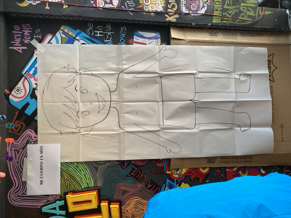 This image depicts an indoor scene in El Alto, Bolivia. A large, folded sheet of white paper featuring a simple, black outline drawing of a smiling boy in shorts is centrally taped to a dark, graffiti-covered wall. Above this drawing, a smaller white paper sign is affixed, bearing the Spanish text "MI CUERPO ES MÍO" (My Body Is Mine). The wall behind the drawing is densely decorated with multi-colored graffiti, including abstract patterns, stylized characters, and partial text elements such as "4 HICITO NOMÁS ES" and "SE HA ESTIDO loves." Small, colorful pom-poms are strung horizontally across the top of the wall. To the left, a section of bright blue fabric or clothing is visible. At the bottom of the frame, several cardboard boxes are stacked, one prominently displaying text indicating it is packaging for a "MESA ROBLE TABLE 80x80" and a "REY" brand logo. The setup suggests an educational display or public awareness installation.
