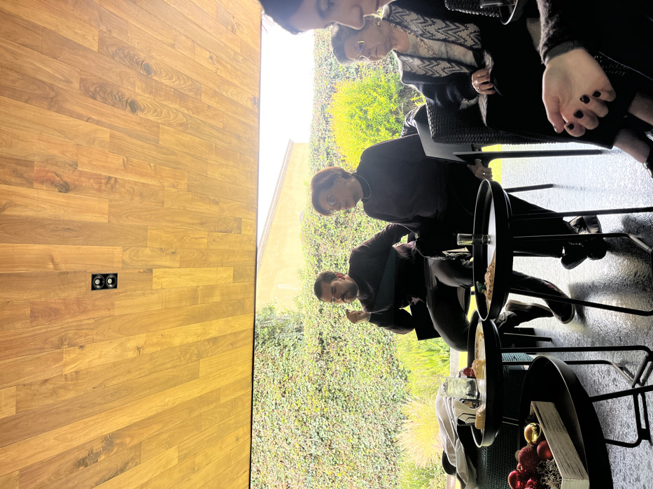 Four people sit outdoors at a table with snacks. The group, situated near a wall covered with greenery, includes two women in dark jackets, another woman in a plum-colored outfit, and a man in a dark suit. Two black table-like stands, filled with treats, stand to the side. The image is shot from a high angle, with a partially visible wooden floor on the left.
