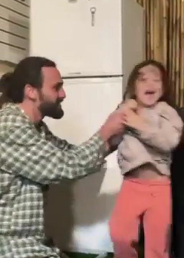 In a nighttime outdoor scene, a man wearing a plaid shirt and brown pants kneels in front of a young girl in a grey hoodie and pink pants