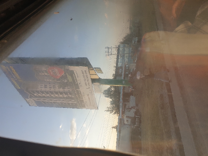 A roadside billboard advertises "Luxury A Million" apartments, featuring a high-rise building image. Power lines stretch across the pale sky. A roadside view includes a grassy area, buildings, vehicles, and a street. The perspective appears to be taken from inside a vehicle, with reflections visible on the glass. The overall scene is somewhat hazy, possibly due to the conditions of the glass.