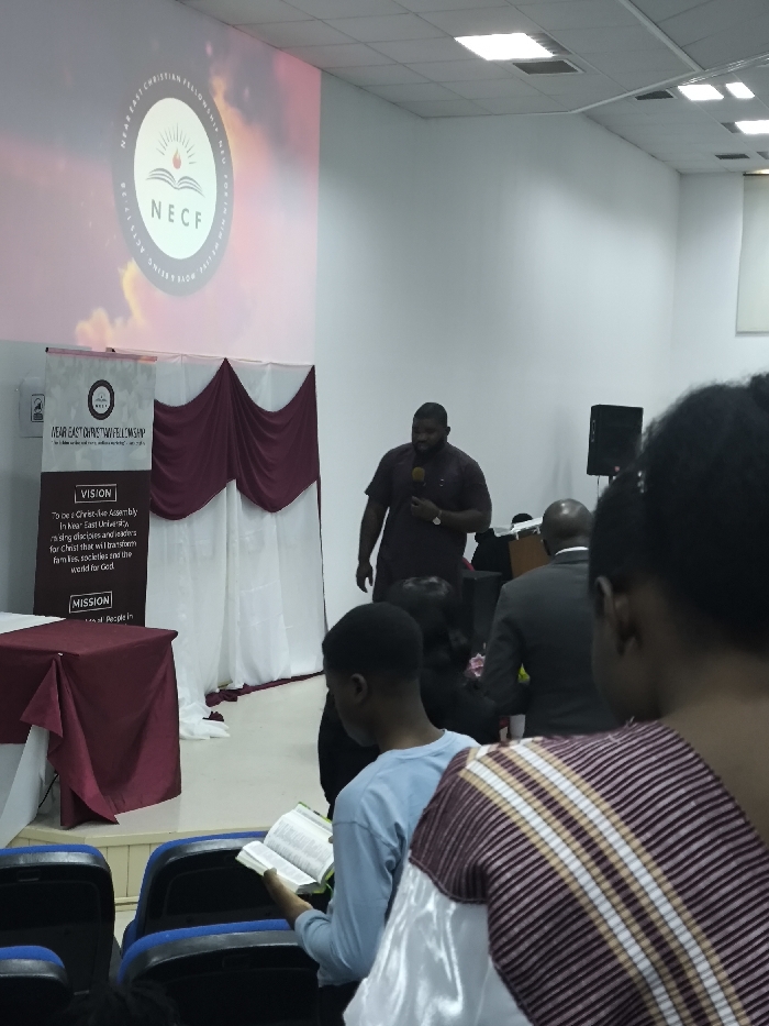 An indoor scene in Kızılbaş, Northern Cyprus / Cyprus, portrays a religious gathering or fellowship event. A male speaker, appearing to be of African descent with a beard, wears a dark short-sleeved shirt and a watch, standing centrally at the front while holding a microphone in his left hand and addressing an unseen audience. Behind him, on the left wall, a large projector screen displays a circular logo for "NEAR EAST CHRISTIAN FELLOWSHIP" (NECF) featuring an open book and radiating sun, encircled by the text "ACTS 17:28 FOR IN HIM WE LIVE AND MOVE AND HAVE OUR BEING" against a warm, cloudy background. Below the projection, a vertical banner displays the same NECF logo, name, and partially legible "VISION" and "MISSION" statements, including "To be a Christian Assembly in Near East University..." White fabric drapes with maroon swags are arranged along the wall behind the speaker. To the far left, a table is covered with a maroon tablecloth. In the immediate foreground, from a rear perspective, several audience members are seated in blue and black chairs. A young male in a light blue long-sleeved shirt is seen reading an open book, likely a Bible. Another person's back and shoulders, wearing a patterned maroon and beige striped garment over a white top, are partially visible in the extreme foreground. Further back, a male in a dark suit jacket and other individuals are partially visible, all facing the speaker. A black speaker unit rests on the floor to the speaker's right. The room is brightly lit by overhead fluorescent panel lights embedded in a white dropped ceiling.