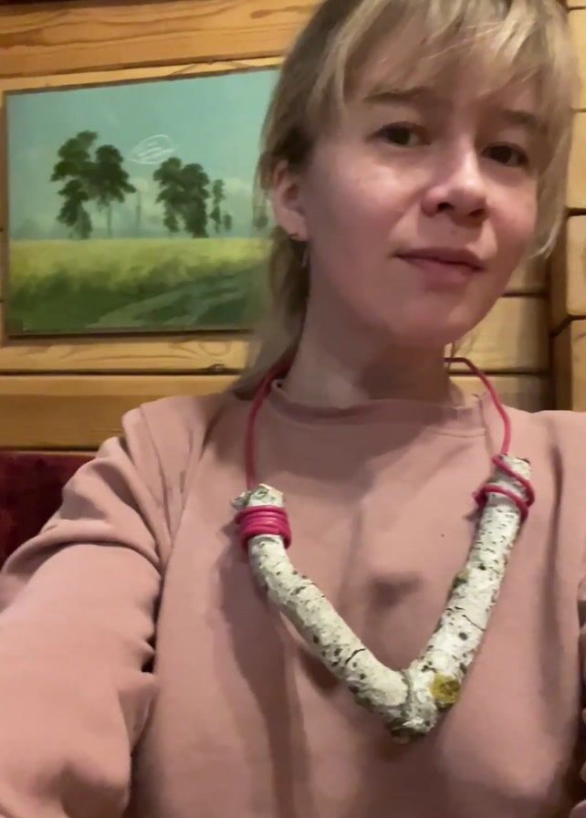 A woman is displaying a large necklace made of what appears to be birch branches. She is wearing a light pink sweatshirt. She rubs her hand across her chest, over the necklace, a few times while facing the camera. She is indoors, possibly in a cabin or house with exposed wood construction, and there is a framed painting of trees behind her.