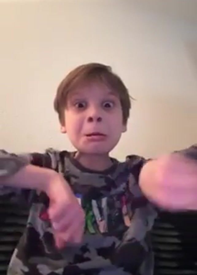 A young boy, likely between the ages of 6 and 10, is sitting on a black sofa and enthusiastically punching or moving his fists toward the camera