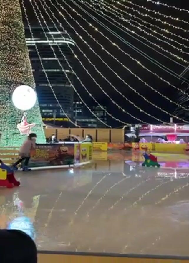 n outdoor ice skating rink at night, filled with people skating, some with the assistance of colorful plastic skating aids. Above the rink, strings of lights are strung across the space, and a tall Christmas tree adorned with lights stands next to the rink. In the background, tall buildings can be seen. The ice on the rink appears wet, reflecting the surrounding lights. The camera slightly pans to the right, capturing more of the rink and the people skating.