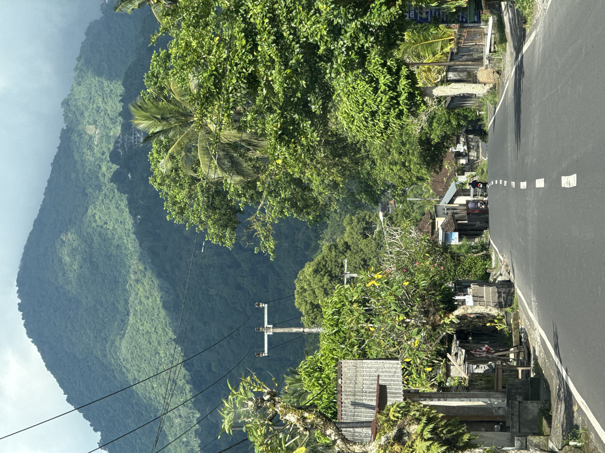 road in Tista, Indonesia, with a large, green mountain in the background and a variety of trees and vegetation along the roadside