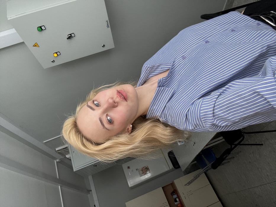 - "The image displays a blonde woman with blue eyes, wearing a blue and white pinstriped collared shirt, presenting a neutral expression while looking directly at the camera" by FM-XK0H12, licensed under CC BY 4.0