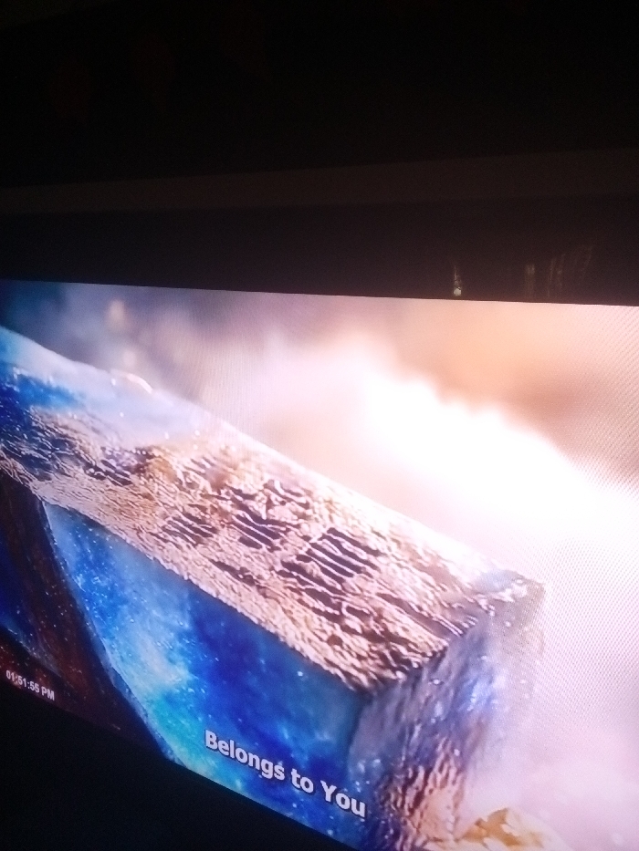 The image displays a digital screen, likely a television or monitor, captured in a dimly lit physical environment. The upper and lower edges of the screen's bezel are visible, indicating the device itself. On the screen, the primary subject is an elongated, roughly rectangular object oriented diagonally, rising from the lower left to the upper right of the frame. The object features a distinct bicolor composition: its lower and front-facing surfaces are a vibrant, translucent blue, resembling crystal or ice with internal light reflections and variations. Its upper and top-facing surfaces are a textured brown-beige, exhibiting fine, parallel, raised ridges consistent with wood grain or organic material. The background behind the object is brightly illuminated with soft, blurred hues of orange, white, and pale brown, suggesting atmospheric light or a luminous backdrop. Text overlays are present on the screen: "01:51:55 PM" appears in white in the lower-left corner, and "Belongs to You" is visible in white, centered along the lower edge of the screen content. No individuals are depicted within the digital display. The physical location of the screen in the city of Unknown, Nigeria cannot be determined from the visual evidence presented.
