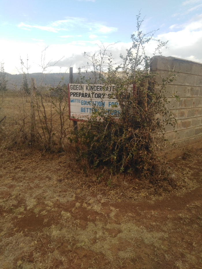 A sign for "Gideon Kindergate Preparatory School" sits partially obscured by overgrown shrubs. The motto "Education for a Better Future" is visible underneath the school name. To the right, a wall made of concrete blocks is partially visible. Sparse, dry vegetation covers the ground, and a few leafless bushes stand to the left of the sign. In the background, a distant mountain range is under a cloudy sky.