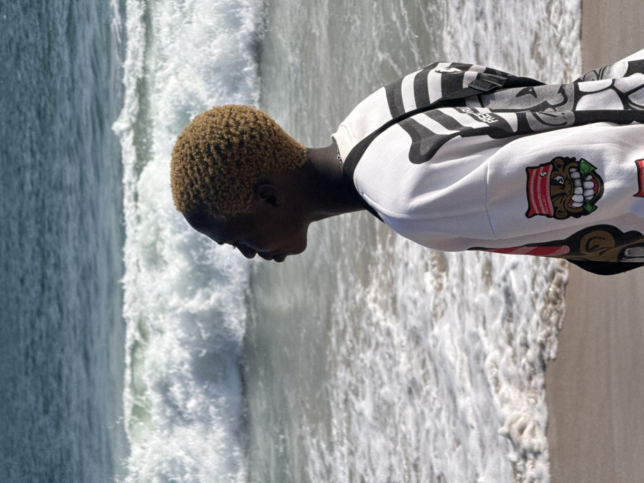 A young individual stands on a sandy beach, captured from the chest up in profile, facing left towards the ocean. The individual has dark skin and short, coily, light brown hair, and wears a thin silver-colored chain around their neck. They are dressed in a white long-sleeved shirt with black trim around the collar. The right sleeve features a patch depicting a cartoonish brown face with large teeth and green currency notes in its mouth, wearing a red and white striped beanie adorned with a dollar sign; "FREE WORLD" text is visible above the patch. The upper left side of the shirt displays a black and white design composed of vertical stripes and abstract shapes, with partial text "FREE RIDE" discernible. In the background, ocean waves crash onto the light brown sandy shore, showing white foam against deeper blue-green water. The scene is located in Mopo Onijebu, Nigeria.