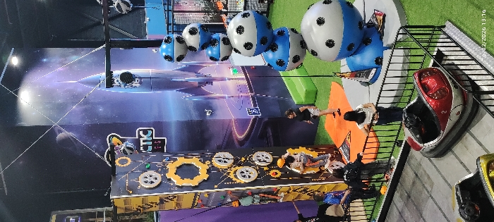 An indoor amusement center features a large mural with a rocket ship and planetary designs. A climbing wall with gears and circular features is visible. Suspended above are blue and white spheres resembling soccer balls. Several individuals are present, with one person climbing on the wall. Bumper cars are lined up near a metal railing, and artificial turf creates a green space adjacent to the climbing area. The overall scene depicts a vibrant and active entertainment environment.