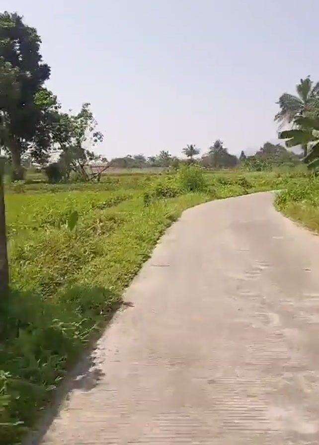 rural road, paved in concrete with lateral grooves. The road curves gently, lined with lush green vegetation on both sides, with rice paddies and scattered trees, including palms, visible in the distance. A white building with a red roof can be seen to the right, and a motorcycle is parked nearby. The sky is clear and bright. The camera appears to be in motion, likely mounted on a vehicle traveling down the road.